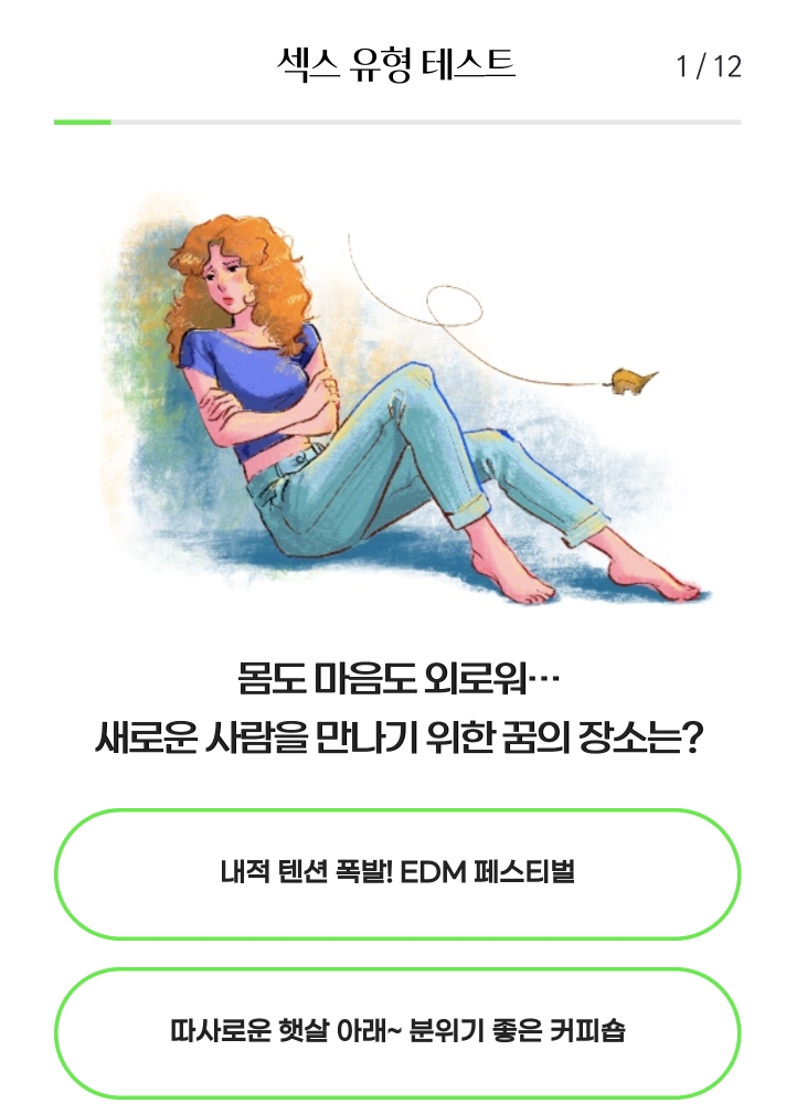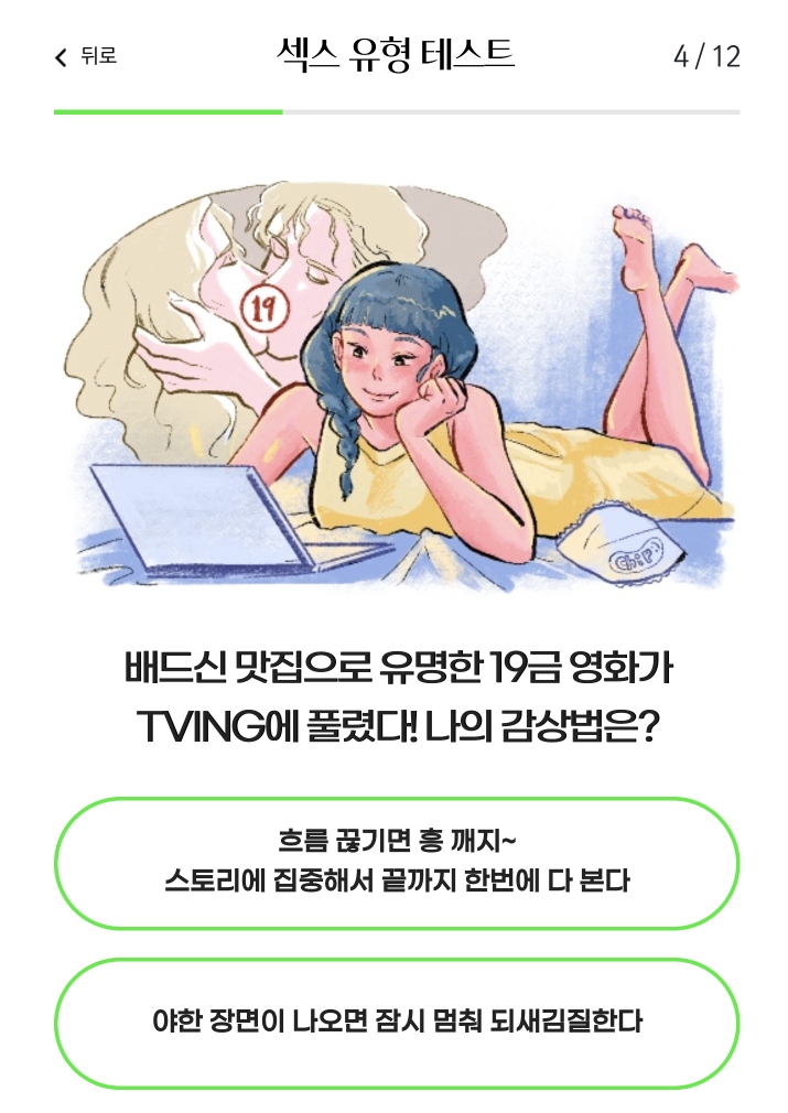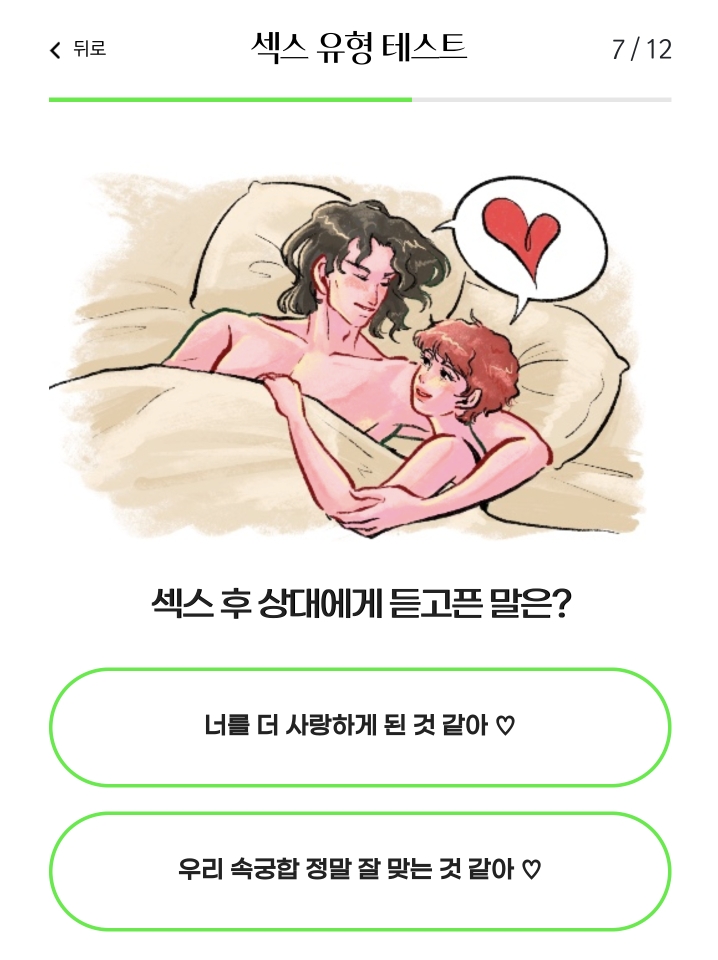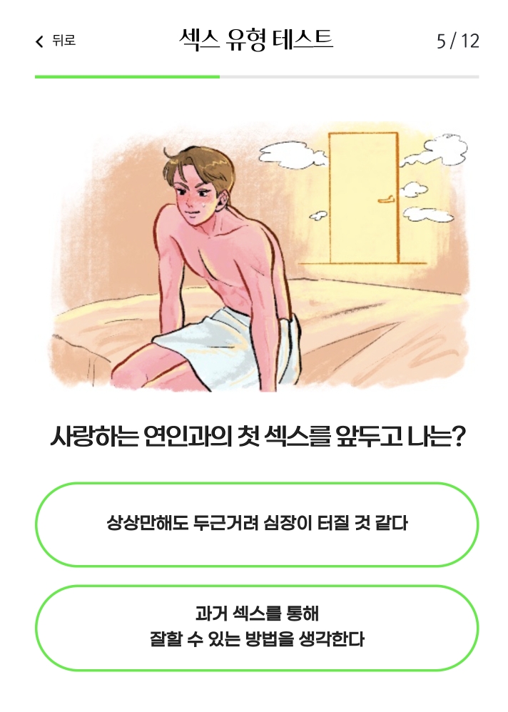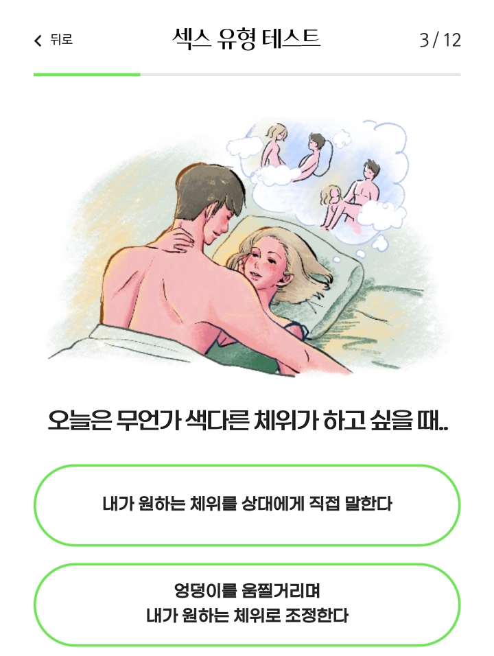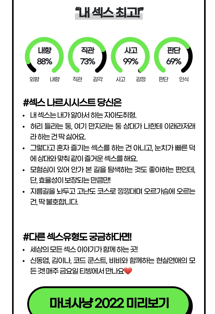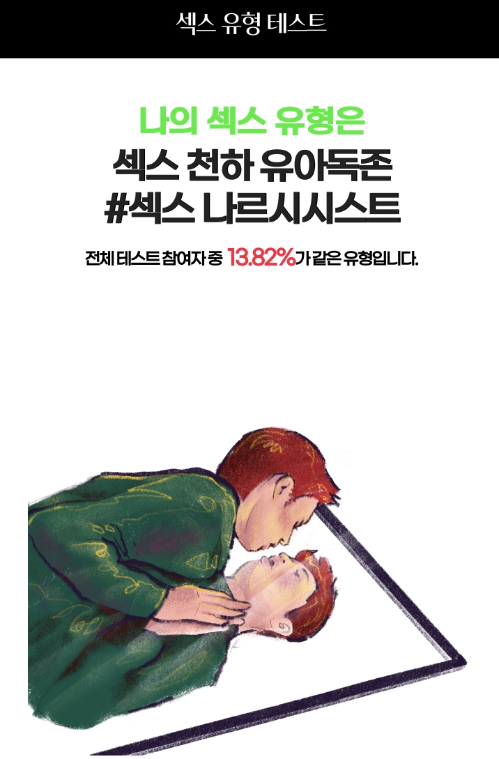나의 ㅅㅅ유형을 알아보는 테스트로 마녀사냥 작가가 만든 테스트라고 한다. 자세히는 참가자 수 31만명이 말해주고 있음. (그리고 지금도 실시간으로 테스트 참가자 수가 늘고 있다) 19금이라 성인인증은 필수.